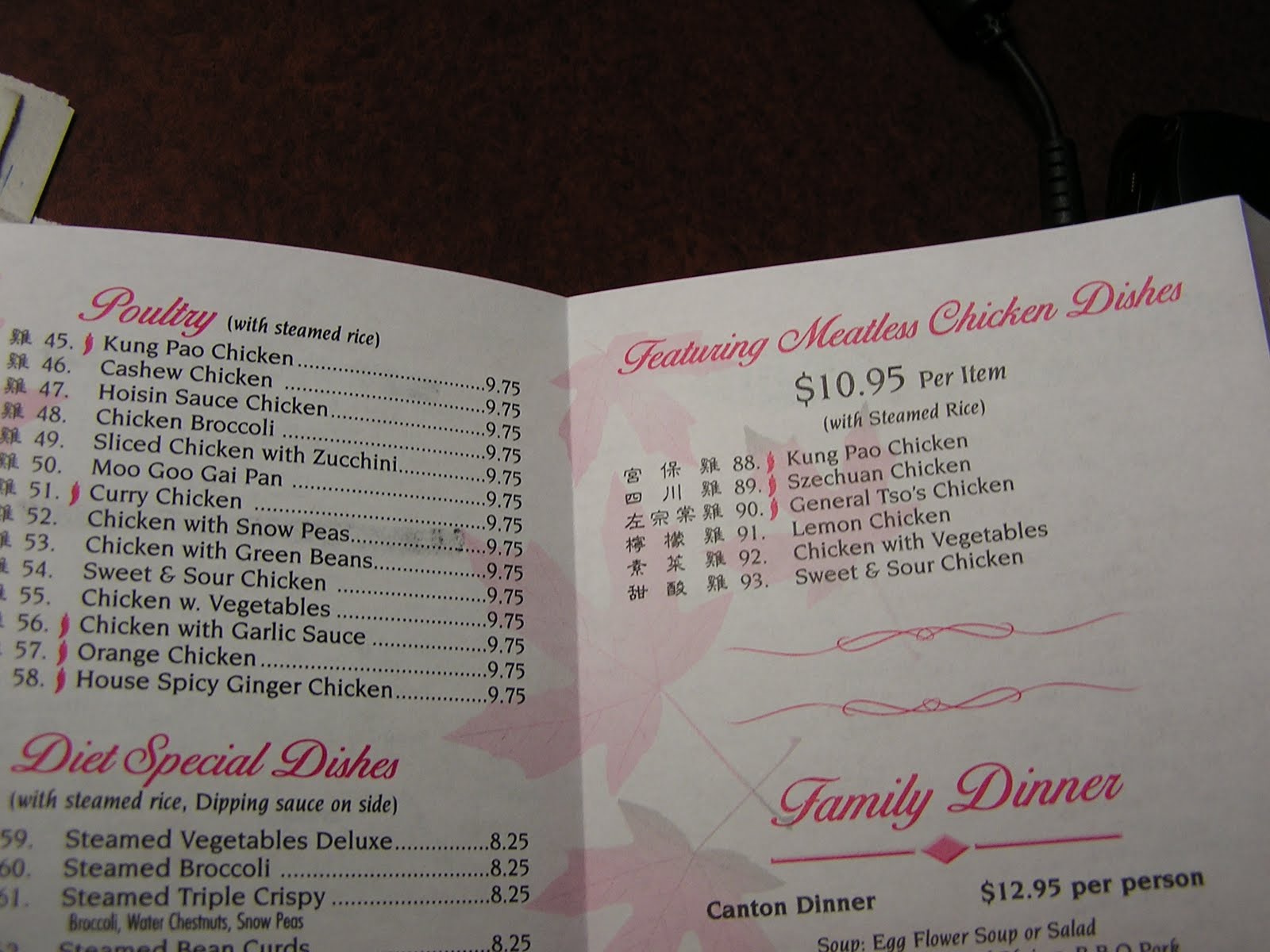 on the right under Meatless Chicken Dinners. This confuses me. Get this - the meatless chicken Kung Pao Chicken is MORE than the meatful Kung Pao Chicken.